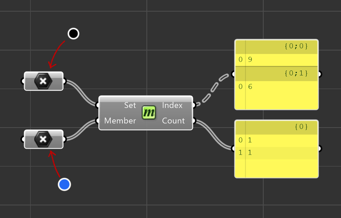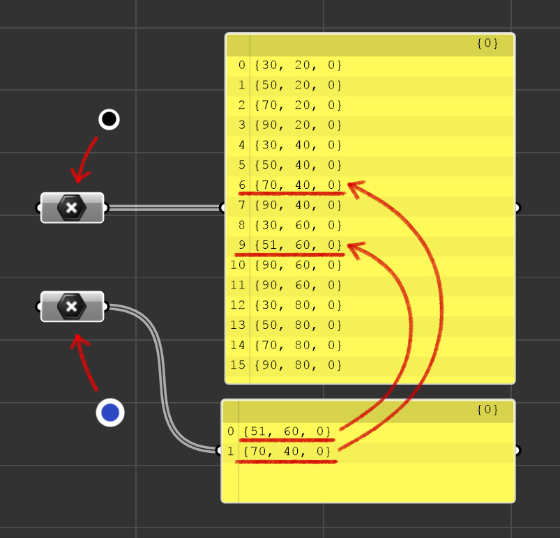 И так, необходимо найти индексы синих точек в списке чёрных точек. В данном случае, конечно, можно воспользоваться специальным нодом — Closest Point, однако в данном случае так же сработает Member Index: